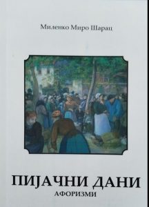 Овом збирком, несумњиво је, Шарац само потврђује раније стечено право да се осјећа комфорно на мјесту на које га је снага и оригиналност његових афоризама поставила, на недовршеном списку мајстора ове књижевне форме, започетим Хипократом још прије више од двије и по хиљаде година, а који се неће завршити све док људски род не изумре због „сазнања да је све речено и све измишљено.“ Истинску свевременост ове збирке и њену несумњиву вриједност и стваралачки домет не може измјерити ни једна критика, а нарочито не ова данашња која се дистанцира од свега, па и себе саме и која се кључно бави питањима који је жанр вреднији а који је мање вриједан или упитан као књижевно жанр, без обзира што су се и многа имена великана свјетске књижевности прославила и потврдила кроз различите жанрове, па и афористички израз, по чему су најчешће и највише спомињана широм земљине кугле. Биће интересантно испратити како ће ова збирка проћи на будућем компетитивном плану и хоће ли се потврдити оно што је својевремено Александар Баљак луцидно примијетио да „наши критичари читају романе, приче, пес- 9 ПИЈАЧНИ ДАНИ ме, драме, есеје, књижевне критике, путописе, али строго пазе да им у руке не дође нека књига афоризама. Јер се не зна какав погубан утицај на њих и њихов стил може имати читање афоризама.“ Упркос таквом „ризику“збирку афоризама „Пијачни дани“, са стваралачком одговорношћу препоручујем сваком истинском љубитељу литературе, а нарочито онима који је неће читати само зато да би видјели да ли ће у њој гдје „налетјети на себе“, него онима који ће у њој препознати „оно једино што није туђе, а то је наше вријеме“ и на тај начин је прихватити и враћати јој се, као свом али и свеопштем трагу у времену. У увјерењу да ће озбиљни издавач, али и неки од мецена књижевности и умјетности са ових наших простора у овој збирци видјети шансу да уложе у свевременост и истинску снагу културе, користим прилику да ову збирку и њима препоручим, а књижевнику Шарцу да честитам на уложеном напору и сигуран сам остварењу које ће допринијети да учврсти позицију регионално значајног аутора хумористичко сатиричне књижевности, те да Пљевља као локална заједница у којој овај аутор живи и ствара додатно ојачају авангардну улогу коју већ деценијама имају у области хумористичко сатиричног стваралаштва.